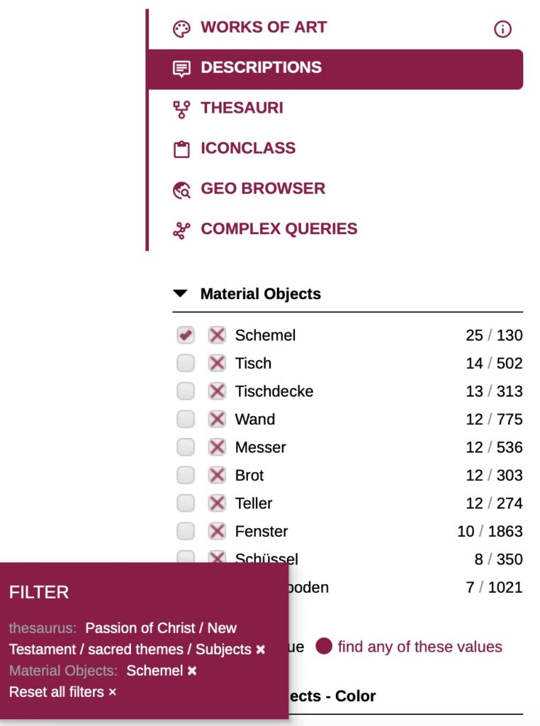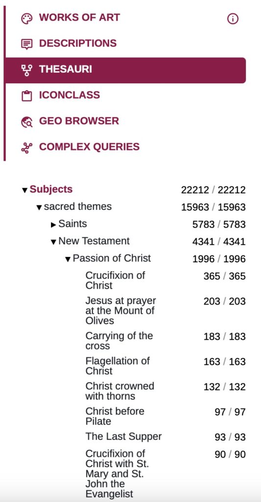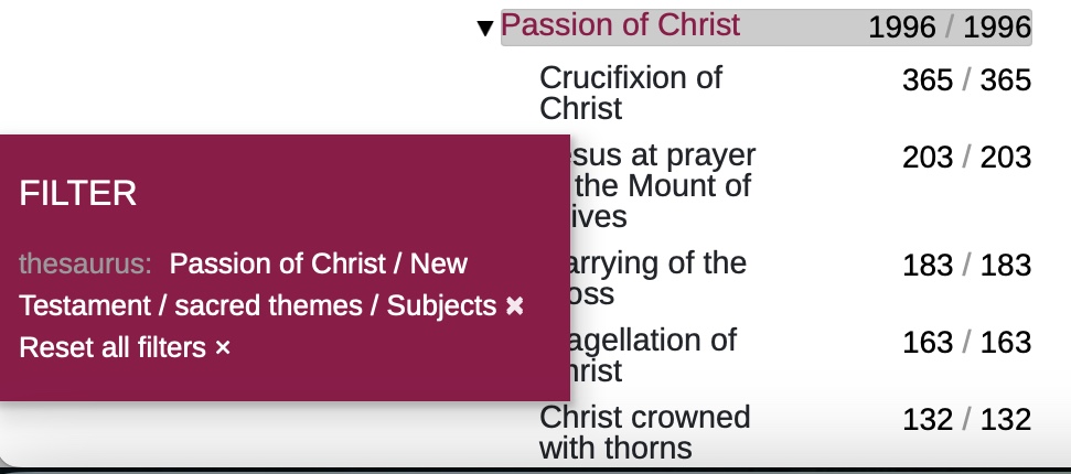 By clicking on the higher-level category ‘Passion of Christ’, you can use this as a search filter. The path you have selected in the thesaurus now appears in the filter box: Thesaurus: Passion of Christ < New Testament < sacred < subjects. (see image)