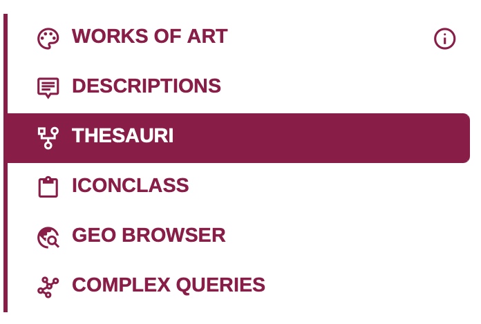In the first case, for example, you searched for ‘cushions’ in the free text field but did not get any results. Assuming (correctly) that cushions were recorded as image elements in the REALonline data, you can continue your search using the thesaurus provided. To do this, click on the ‘Thesauri’ filter (see image).