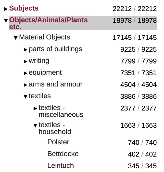 You have now worked your way through Objects/Animals/Plants etc. > Material Objects > Textiles > Textiles – Household and now have a manageable list of terms assigned to the category Textiles – Household. Among them you will also find the term ‘Polster’, which is the more common term for cushions in Austria.
